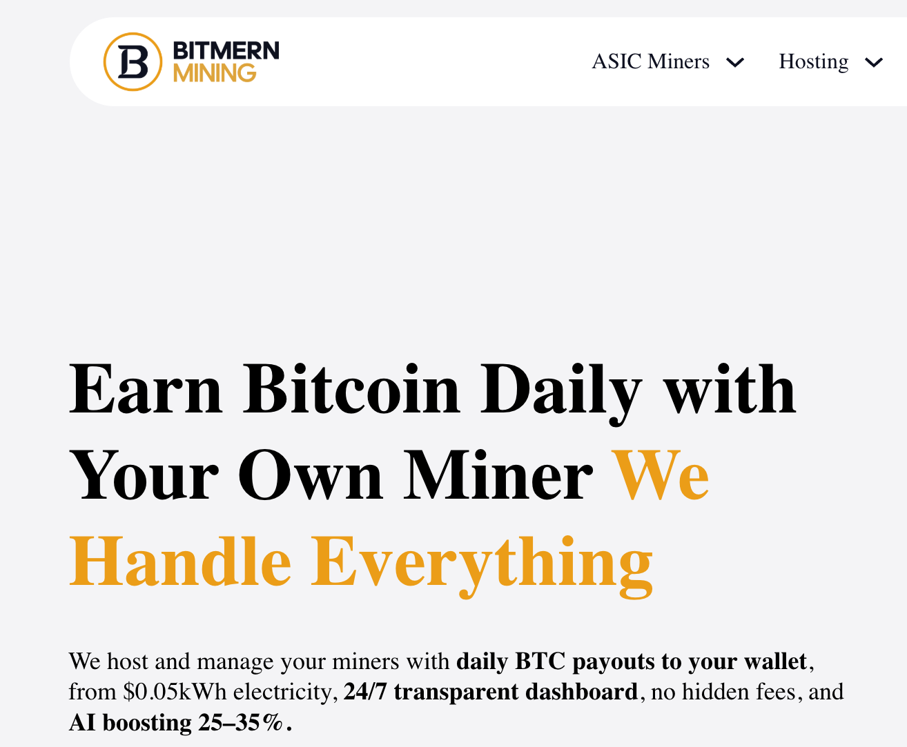 Bitmernmining.com claims to provide Bitcoin mining hardware, low-cost hosting services, and expert support designed to maximize mining returns. According to promotional content on the site, clients can purchase and host ASIC miners, monitor performance, and optimize mining operations. However, promotional statements do not equate to verified operational success, and self-described capabilities should be treated with skepticism without independent data.